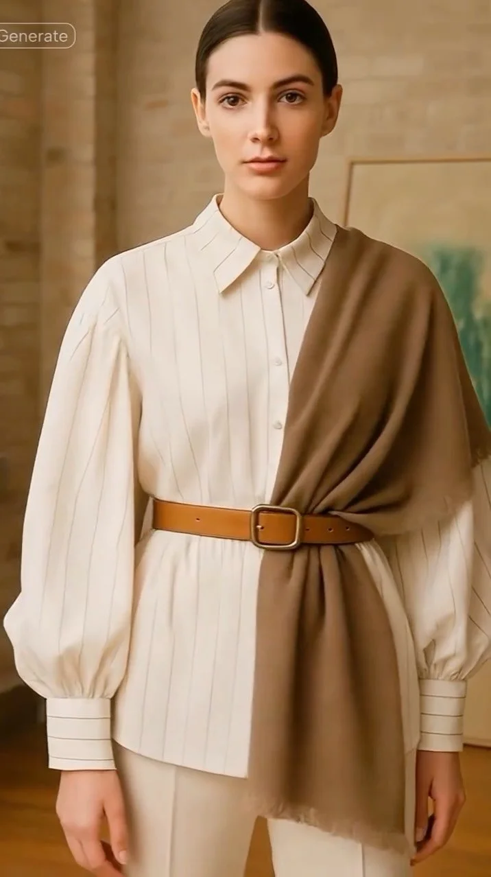 Refined and timeless, this ivory balloon-sleeve shirt embodies effortless sophistication. Designed with voluminous balloon sleeves and a streamlined silhouette, it captures modern femininity through structure and softness. The fine light tan vertical pinstripes subtly elongate the form, creating a clean, tailored aesthetic ideal for day-to-evening wear.