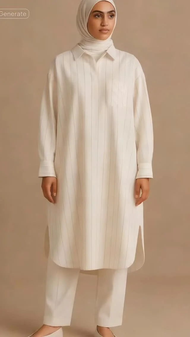 Elegant, versatile, and effortlessly chic and modest, this ivory pinstripe longline shirt tunic blends timeless tailoring with contemporary ease. Designed with fine vertical light tan pinstripes that elongate the silhouette, it features a relaxed, oversized cut that moves fluidly with the body while maintaining a refined structure.