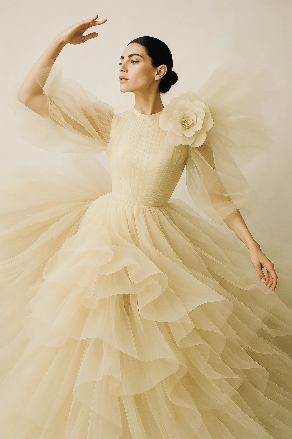 The Ivory whisper gown is a masterpiece crafted from layers of delicate ivory tulle. Designed for poetic grandeur, it features a voluminous silhouette with soft pleating throughout, creating a weightless, cloud-like effect. With the option to choose from three delicate collars and from silk tulle or silk chiffon, the gown’s high ruffled collar and bishop sleeves add a regal aura, while the cinched waist subtly defines the form beneath the floating fabric. With its timeless elegance and romantic drama, this couture piece evokes the grace of renaissance portraiture in a modern, minimalist interpretation
