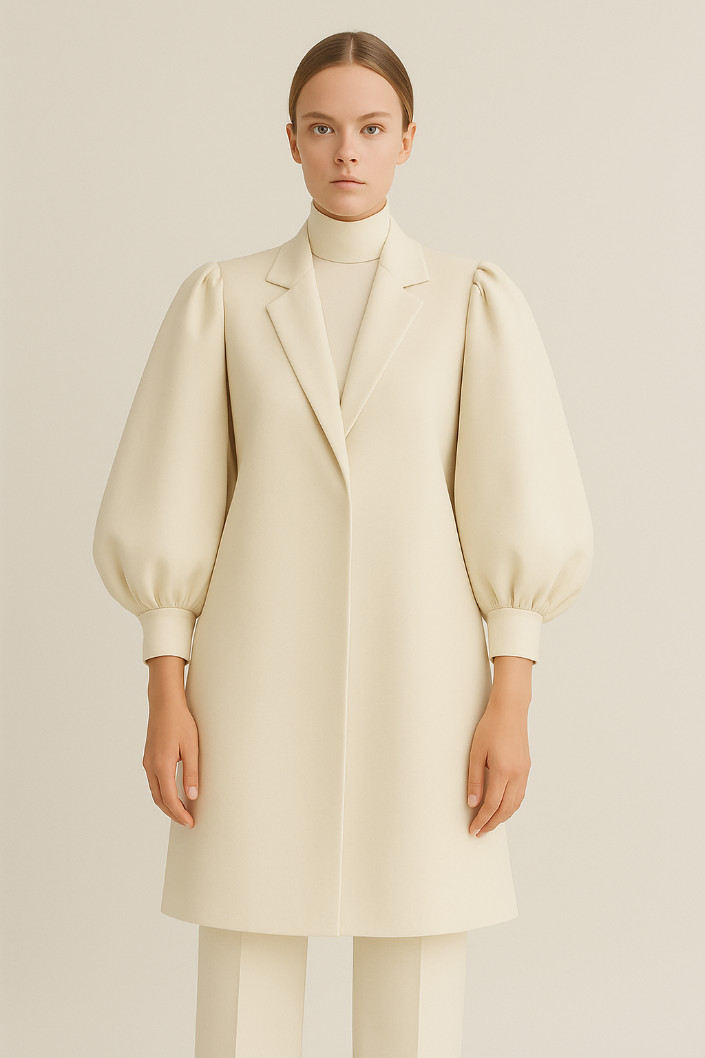 Quiet Authority explores the power of restraint, where sculpted tailoring meets softened form and structure yields to stillness. Precision cuts, poetic layers and a palette of ivory define a wardrobe for the woman who leads without speaking loudly. Matte crepes, dry poplins and soft wool move in harmony, crafted to frame, not overwhelm. This is elegance with intention. Strength in subtlety. Stillness as a statement.